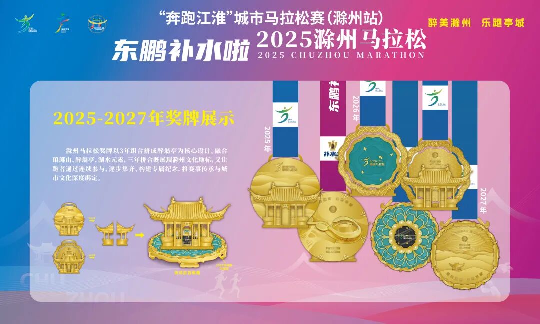 本届滁马完赛奖牌设计成为赛事一大亮点。奖牌以醉翁亭为核心元素,融入琅琊山山水纹理。正面精致呈现醉翁亭造型,呼应“醉美滁州,乐跑亭城”主题,立体设计勾勒出亭台轮廓,完美展现中国传统建筑韵味;奖牌背面以滁州奥体中心地标为主要元素,巧妙串联自然、人文与赛事,让跑者完赛后揽滁州山水人文于一 “牌”,铭记乐跑亭城的难忘历程。