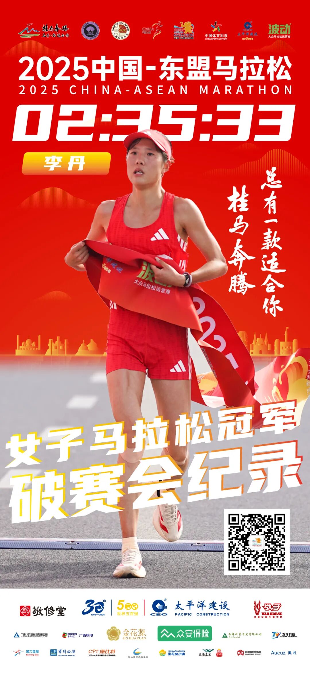 李丹以2小时35分33秒的成绩夺得女子组冠军。打破中国-东盟马拉松女子组赛会纪录。